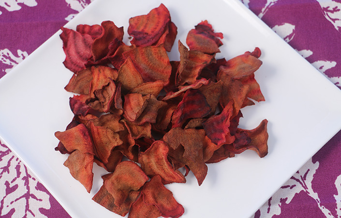 Bake the chips at 350°F for about 20 minutes watching carefully! The beet chips are done when they’ve totally changed color and are crispy all the way through. I found that beets that were still red were soft in the middle. I found myself adding 5 minutes to the timer and checking often until they were totally done. Cool on a wire rack to allow them to crisp up. Beet Chips are best eaten soon after they come out of the oven.