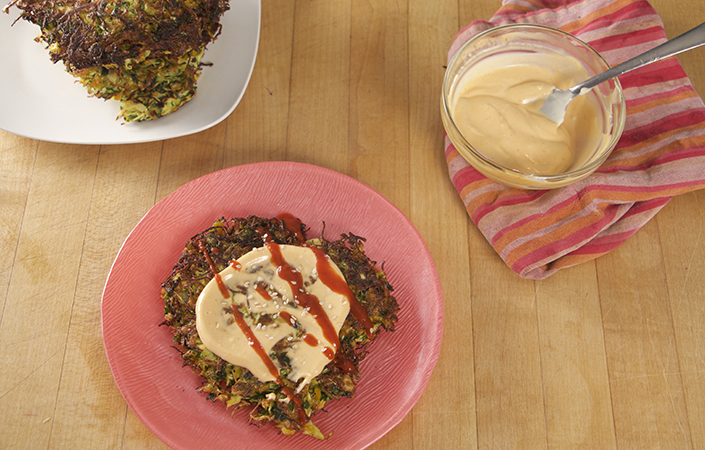 I first encountered these meal size fritters at Asparaganza, and they’ve been on my list to try ever since then! Okonamiyaki (just pronounce it phonetically) is a Japanese street-food snack that’s a great way to use up a bunch of CSA veggies, then top it with a tasty sauce. The traditional sauce for okonamiyaki is a sweet/savory dark sauce that I’d compare to a salty plum sauce, plus a creamy mayo type sauce. In lieu of tracking down the sauce, or mixing a bunch of condiments together to make one, I went with a sriracha spiked mayo + more sriracha. It was perfect.